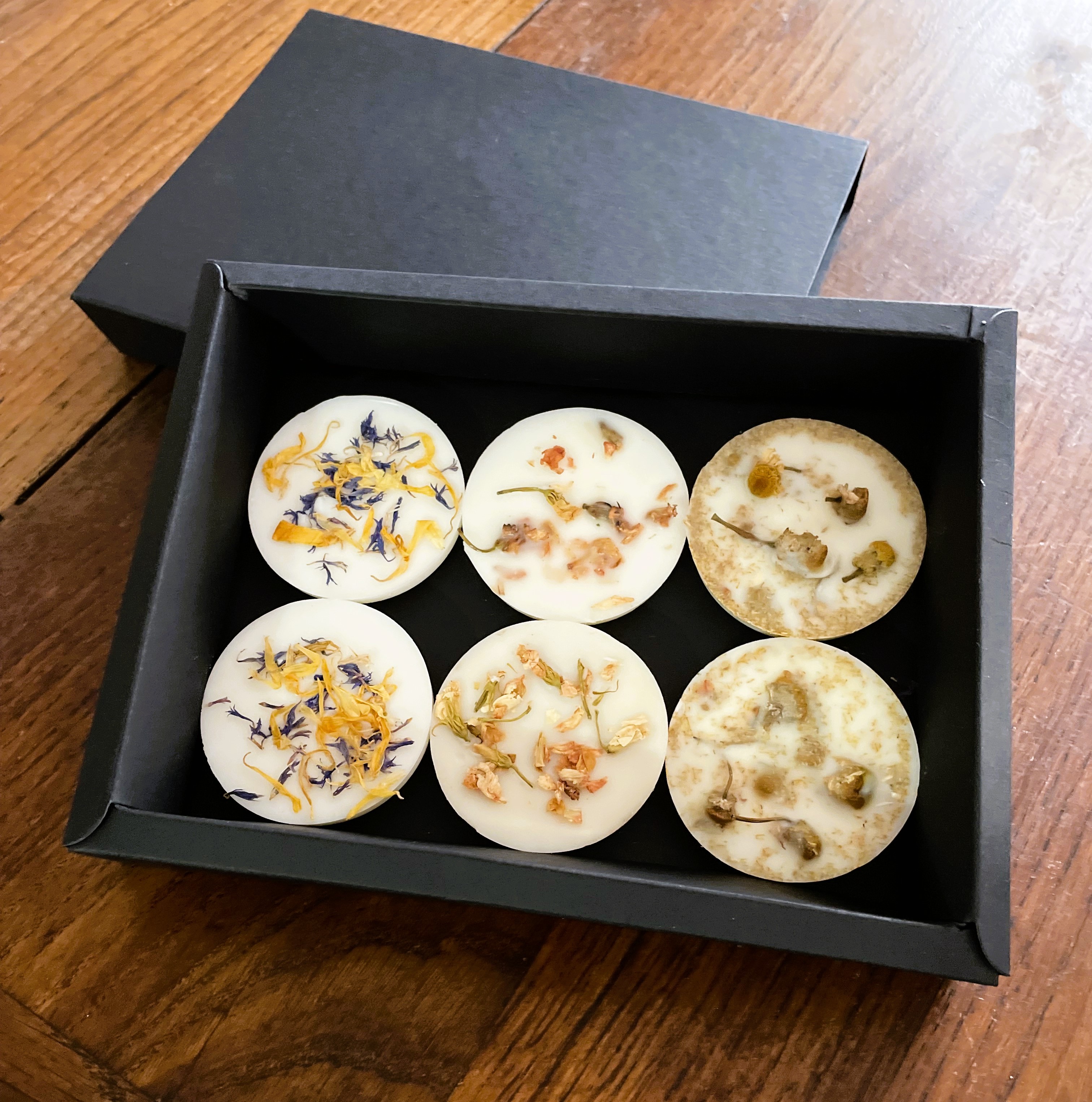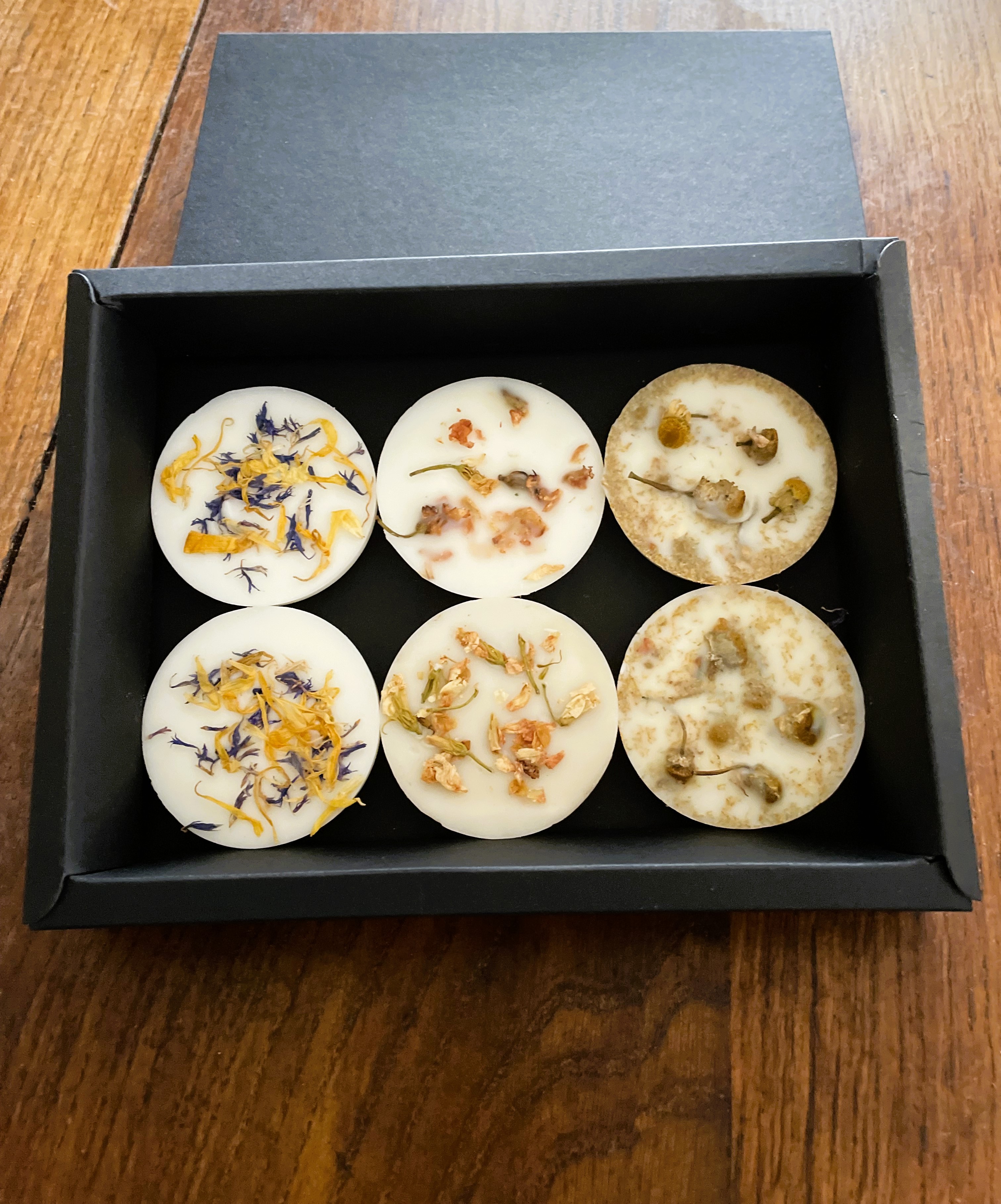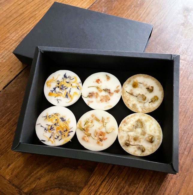 Le coffret fondant fleuri est composé de deux fondants fleurs blanches, deux fondants camomille et deux fondants exotiques. Chacun de ces fondants sont également disponibles en individuel sur le site.