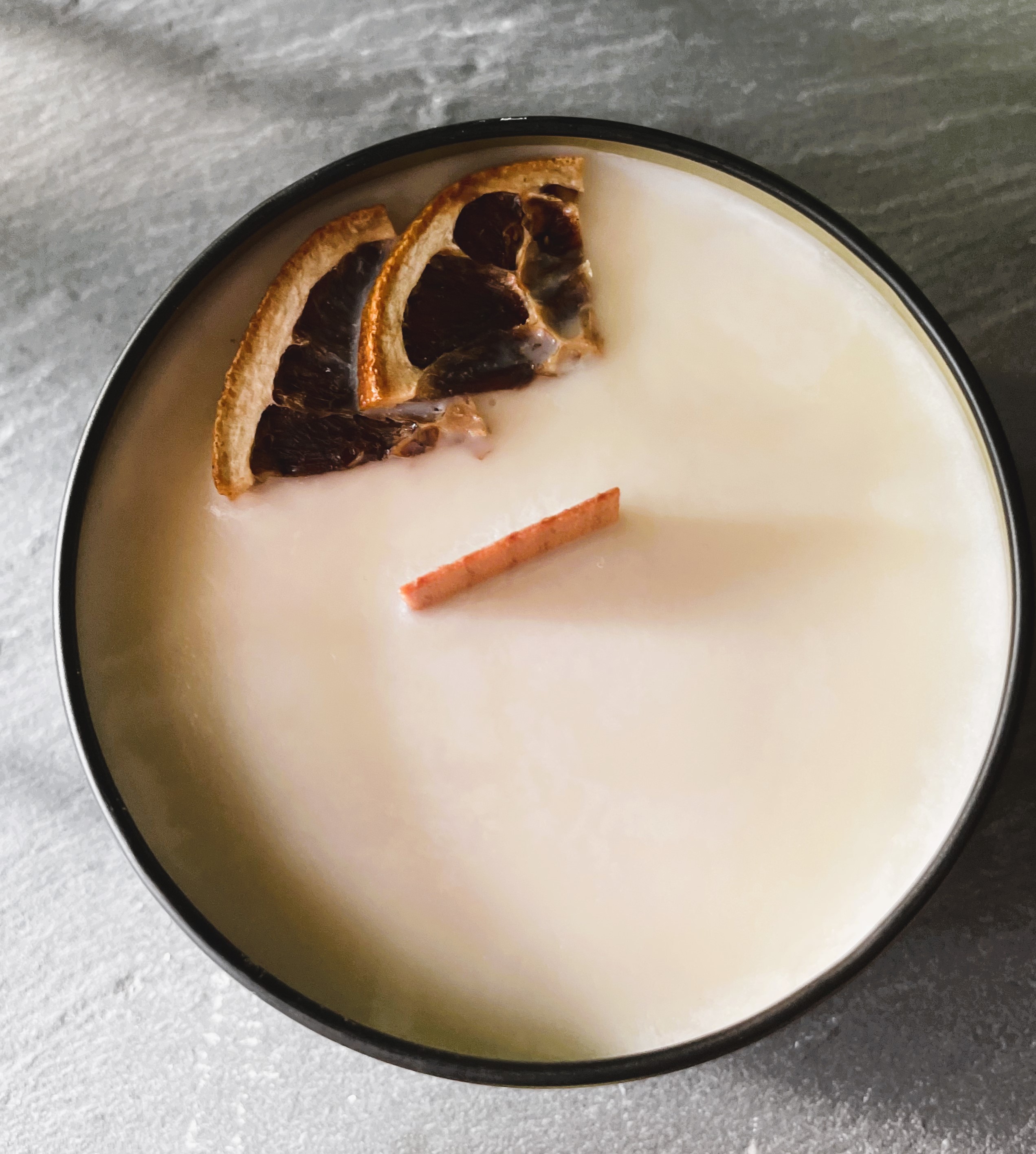 Composition : 90 % cire de soja 100 % naturelle, 10 % d'huiles essentielles, colorant, orange séchée.