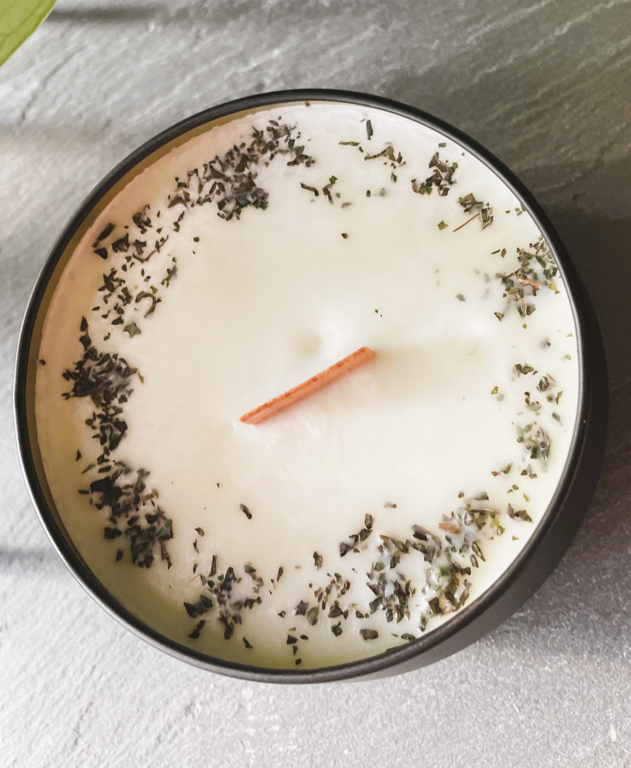 Composition : 90 % cire de soja 100 % naturelle, 10 % d'huiles essentielles, colorant, feuilles de menthe séchée.