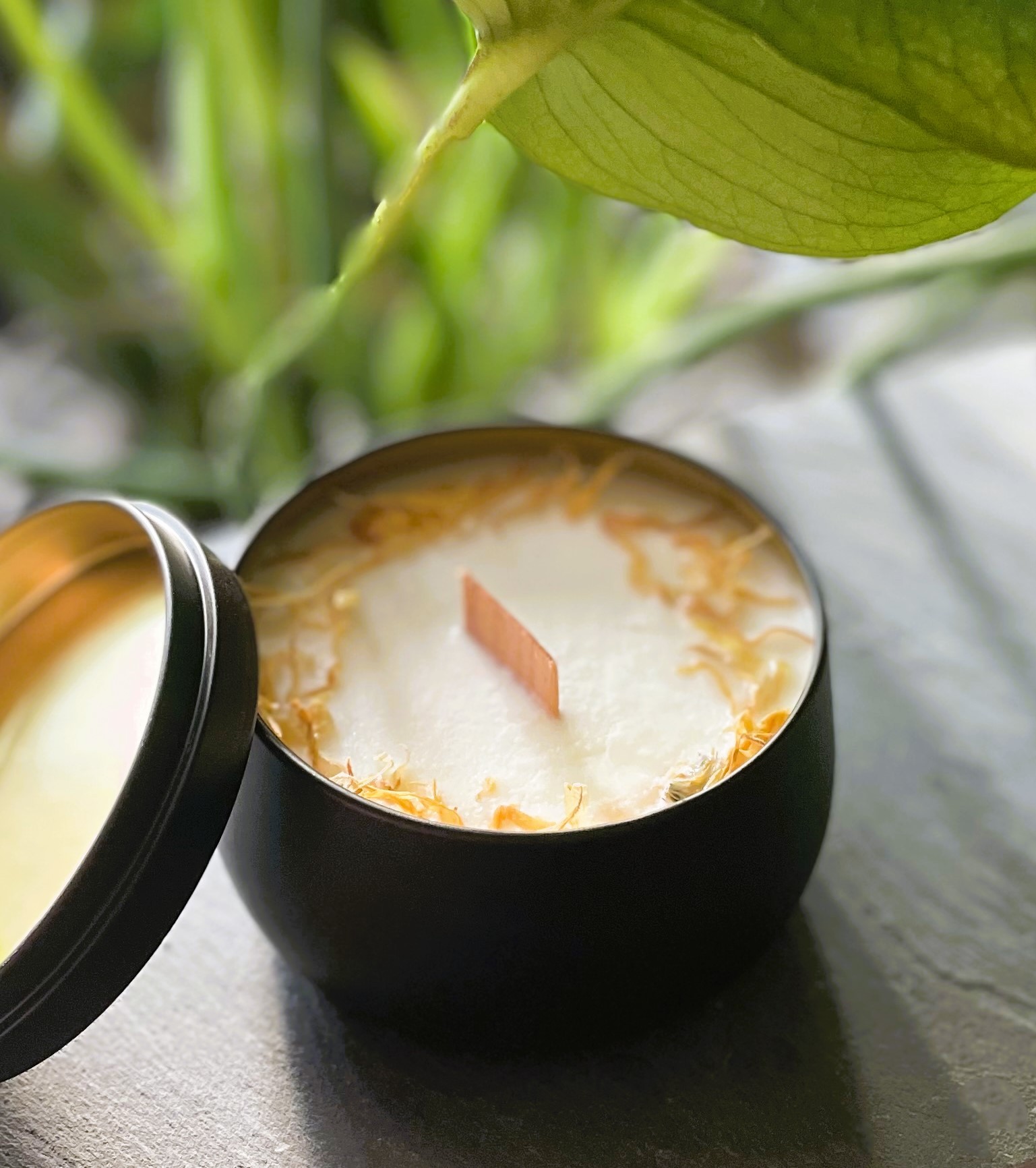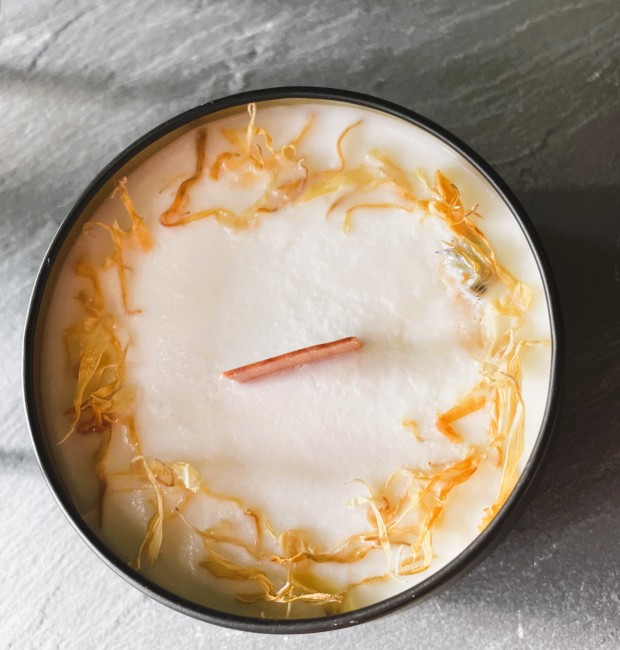 Composition : 90 % cire de soja 100 % naturelle, 10 % d'huiles essentielles, colorant, fleurs de souci séchée.