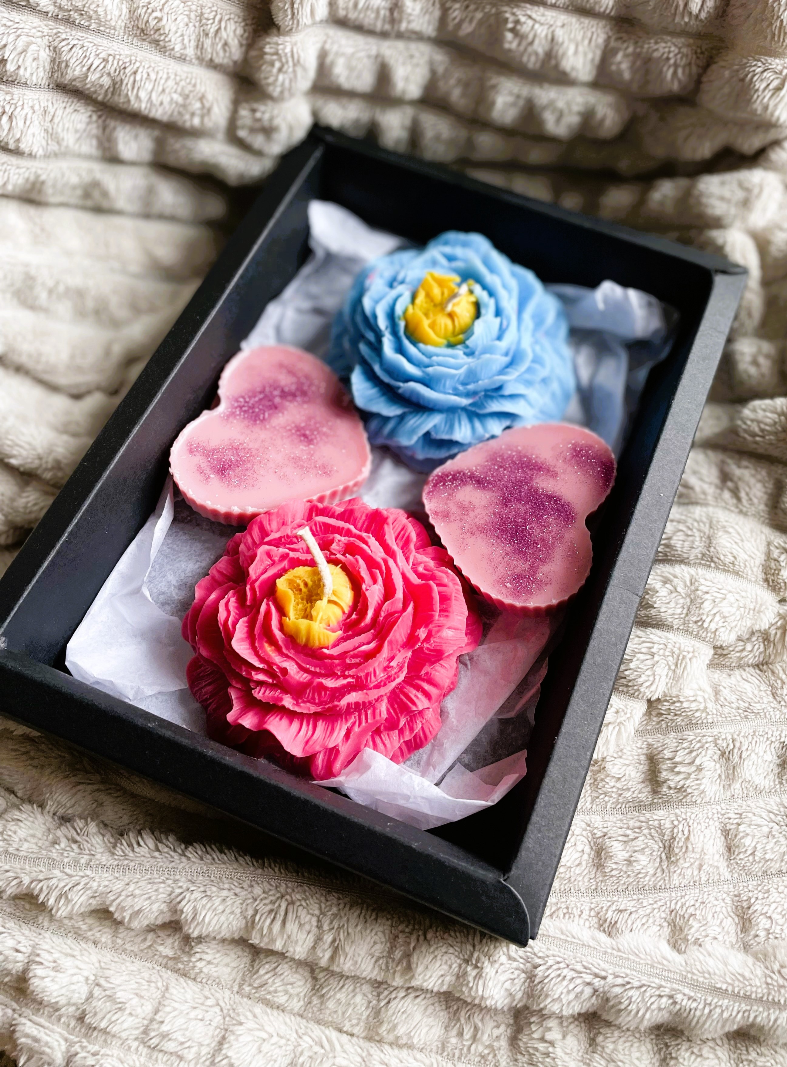 Ce coffret Saint-Valentin contient deux bougies fleurs (rose et bleu) et deux fondants cœur.