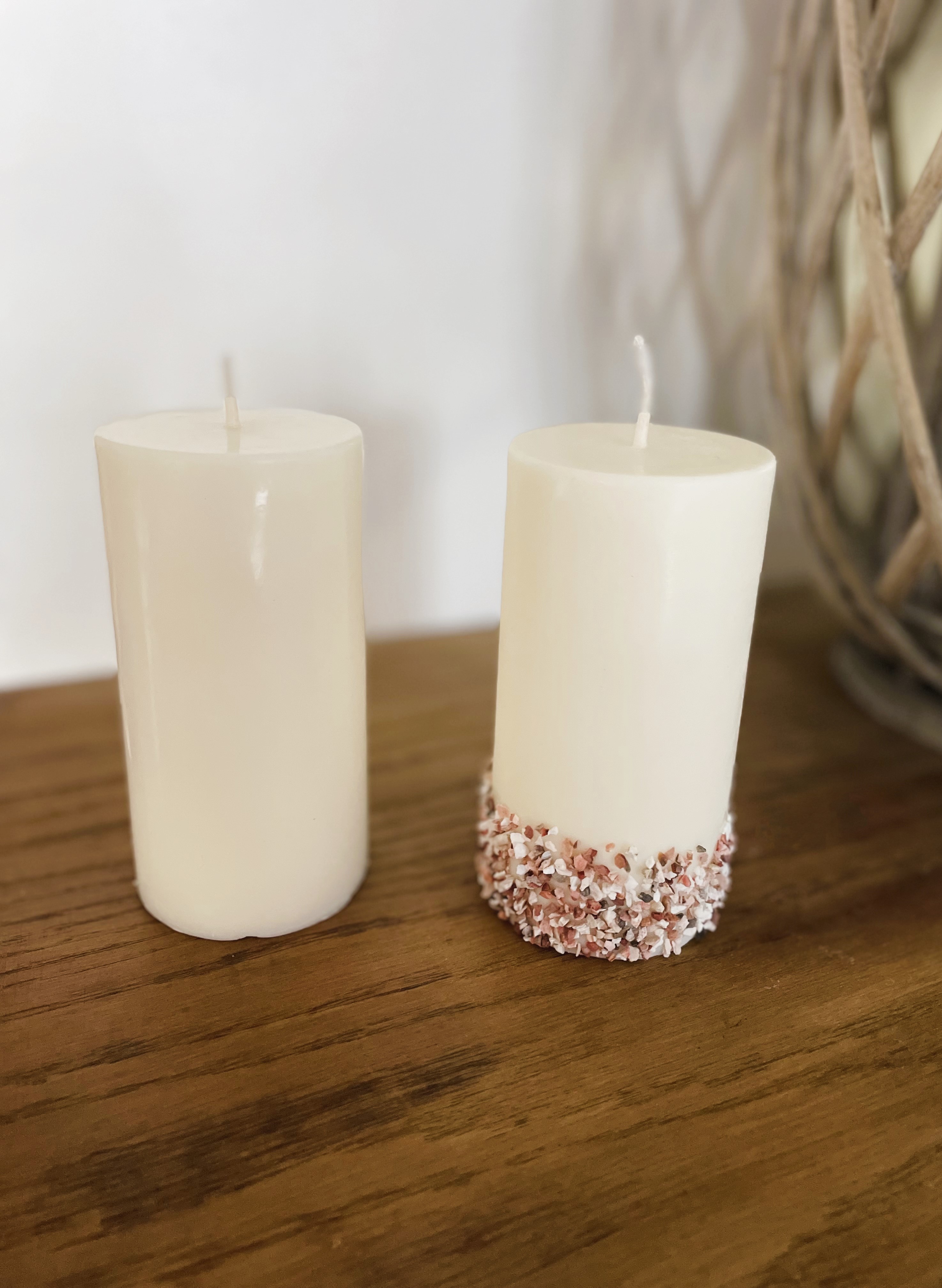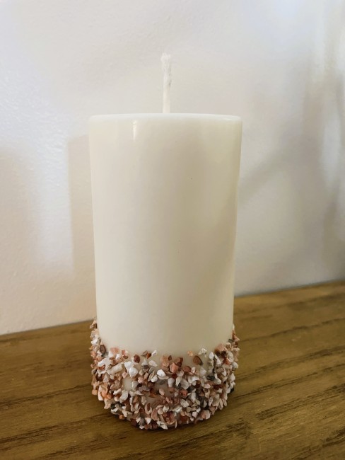 La bougie cylindre "gravillon" donnera à votre décoration une touche rustique. Elle est agrémentée d'une ligne de gravillon dans les tons blanc, gris et rose.